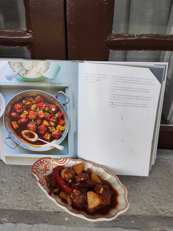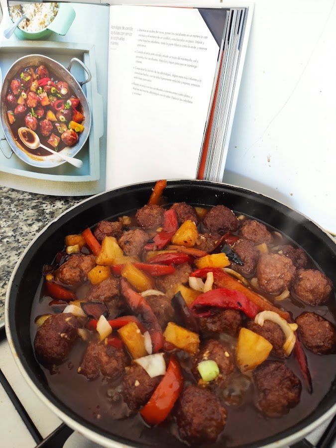 Cuando las albóndigas estén doradas, añadimos el ajo y el pimiento reservados. Vertemos todo el almíbar de la piña en conserva, pero solo la mitad de los trozos (pero si quieres que el plato resulte muy dulce, puedes echarlos todos), el ketchup, el vinagre balsámico, la miel y el zumo de lima exprimido. Removemos y dejamos cocer 8 minutos, removiendo de vez en cuando.