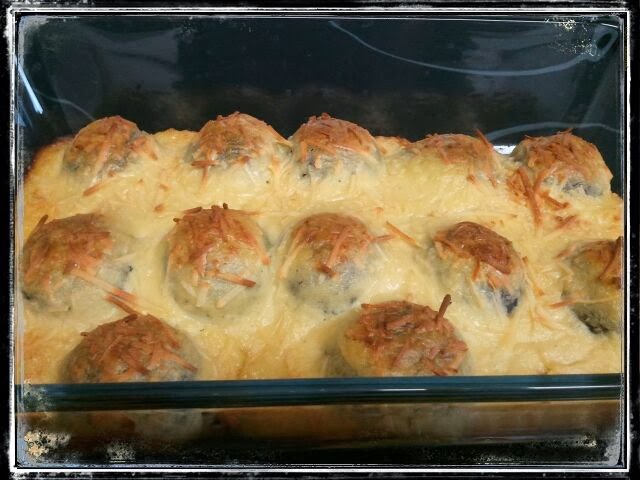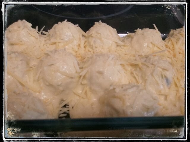 Colocamos las albóndigas en una bandeja de horno. Repartimos la salsa por encima.