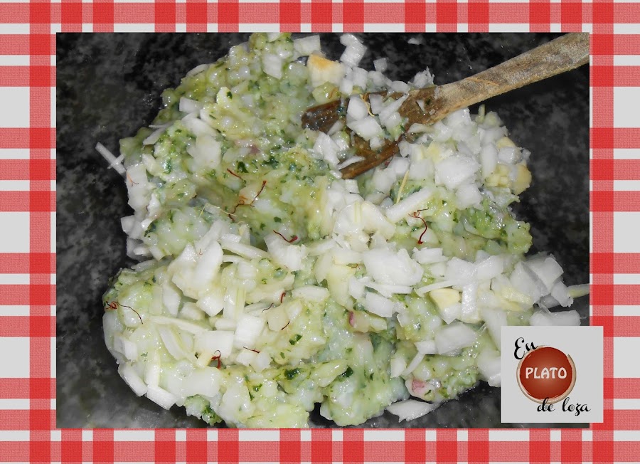 Pues cojo mi "tape" para albóndigas y lo vuelco en un cuenco, al que añado un diente de ajo más, unas cuantas hebras de azafrán, sal, una media cebolla muy picadita y remuevo para mezclar bien.