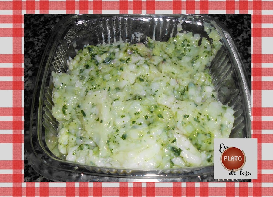 Vamos a una de las maravillosas "choquerías" de la plaza de abastos de Huelva y eliges el choco que te gusta y le dices que te lo pique para albóndigas. Y ellos amablemente si quieres te echan hasta perejil y un par de ajitos (si vas a congelar el choco antes de cocinarlo elígelo mejor sin este aderezo). Mirad como lo sirven. Este es de la choquería Hermanos Campoy. Y no es por hacerles publicidad pero me encantan estos sitios donde te atienden con una gran sonrisa.