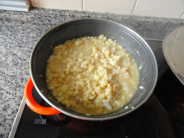 He puesto a dorar la cebolla cortada pequeñita, y a continuación he agregado el choco picadito, yo lo he picado en la picadora, las especias, y la sal. Y medio vasito de caldo de cocer las "cáscaras" de los gambones, lo dejo todo reducir, y dos o tres minutos antes de apartar agrego los gambones troceados.