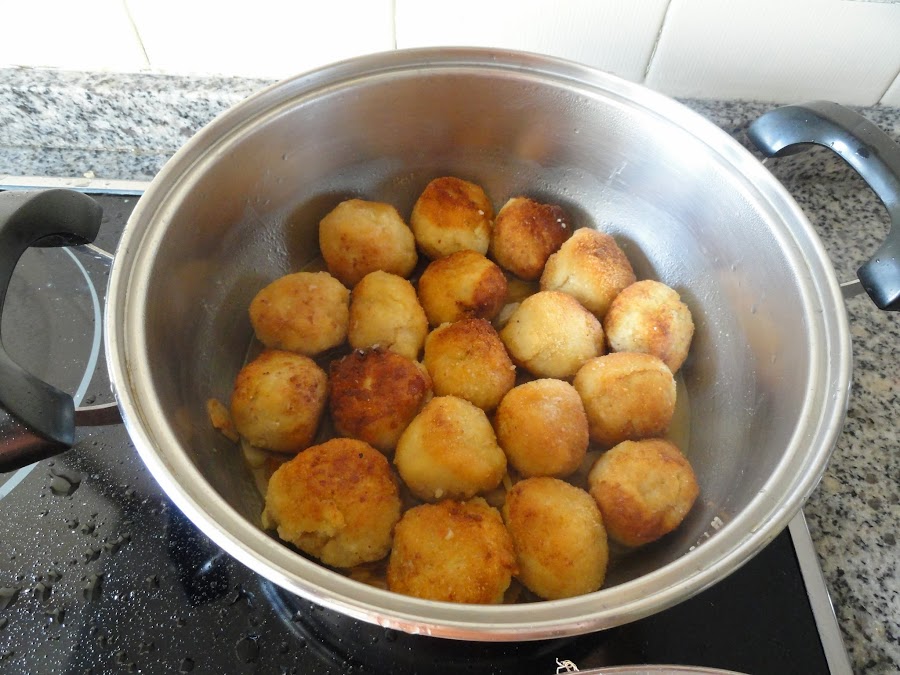Formamos las albóndigas, las pasamos por huevo y pan rallado y las freímos y reservamos.Cuidar que esté bien cubierta del rebozado porque si no salta el aceite. Tratar con cariño porque son muy frágiles ellas y se rompen...