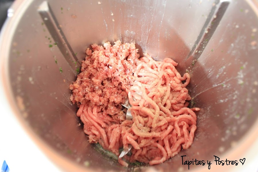 Añadimos la carne picada, el jamón que teníamos reservado y las especias, sal, pimienta y comino. Mezclamos 30 segundos a velocidad 3.