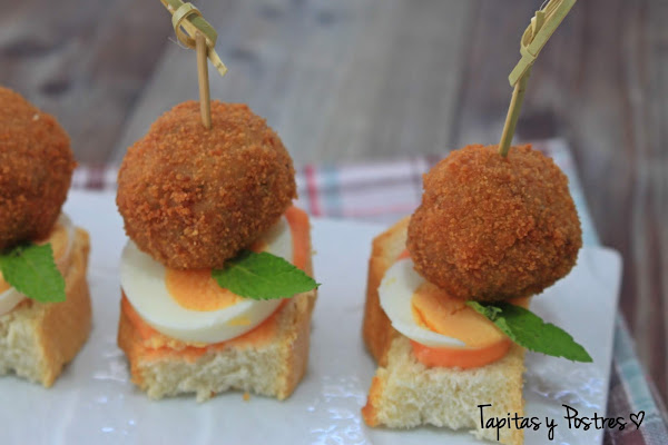 Las presentamos en una rodajita de pan donde habremos puesto una cucharadita de porra o salmorejo, una rodaja de huevo cocido, la albóndiga y una hojita de menta para decorar.