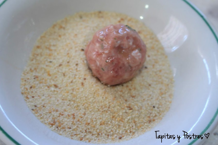 Pasamos las albóndigas primero por huevo batido y después por pan rallado y las freímos en abundante aceite caliente hasta que estén bien doradas.