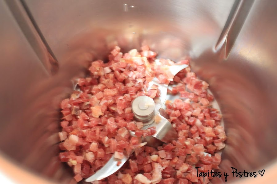 Ponemos el jamón serrano en taquitos en el vaso de la thermomix y damos 6 golpes de turbo para picarlo bien. Sacamos y reservamos.