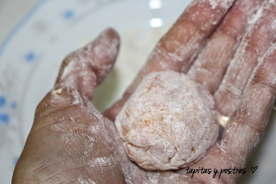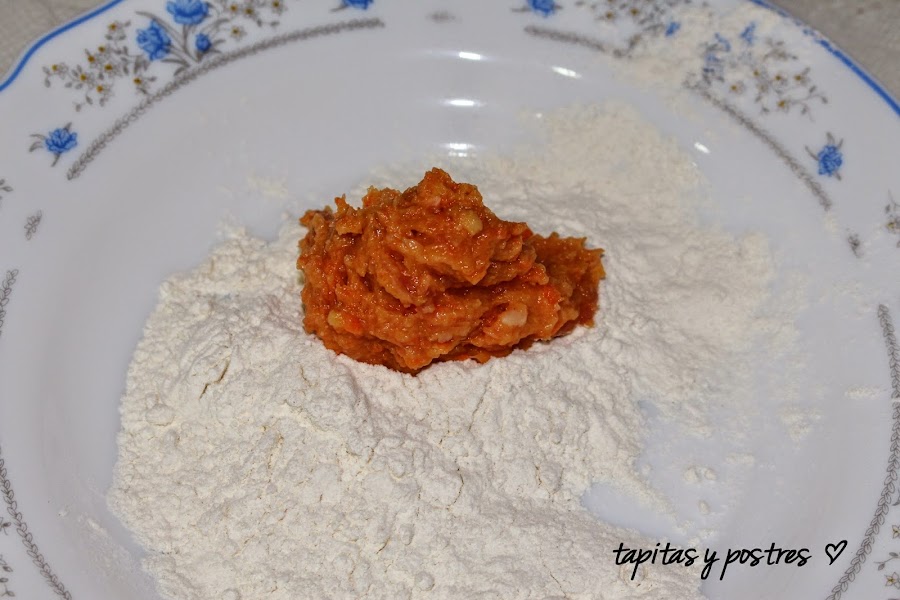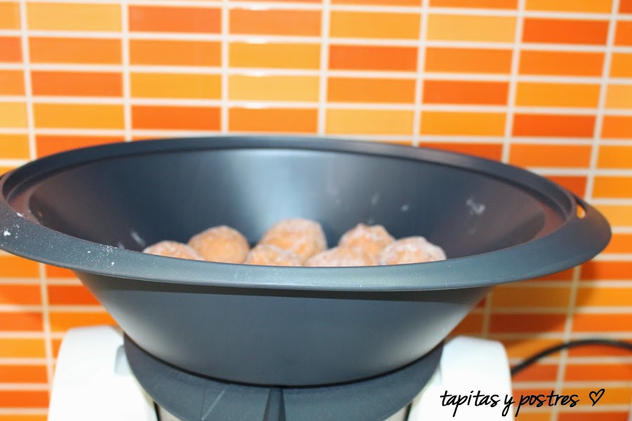 Sacamos una cucharada de masa y vamos haciendo las albóndigas rebozándolas en harina. Las vamos colocando en el recipiente Varoma y reservamos.