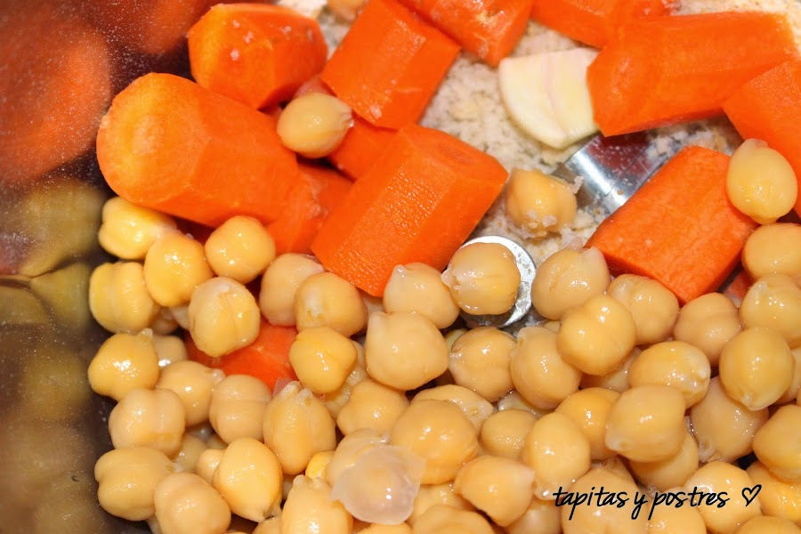 Al pan rallado le añadimos las zanahorias, los garbanzos enjuagados y el ajo. Lo trituramos todo.