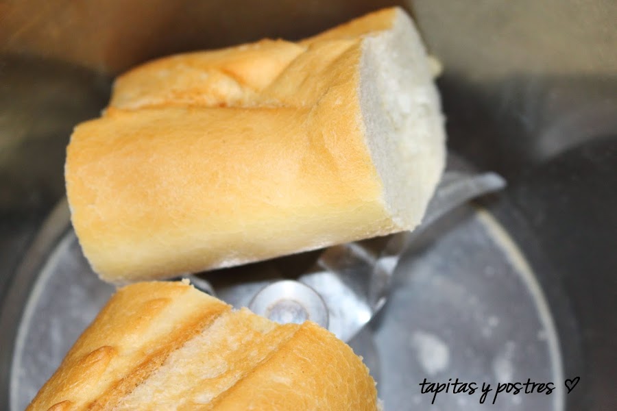 Primero rallamos el pan. Como yo no tenía del comprado he puesto dos trozos de pan del día anterior. Unos 55 gramos.