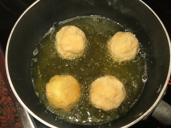 Troceamos la panceta y la salteamos en la misma sartén que la cebolla, una vez dorada la añadimos a la fuente donde tenemos el resto, le añadimos un poco de sal y le damos varias vueltas. Cuando la mezcla se atempere se da forma a las albóndigas.