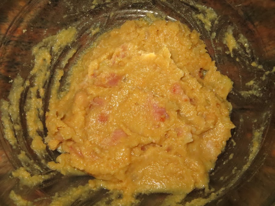 Pelamos y picamos muy fino las cebollas y los ajos con un chorro de aceite en la sartén. Una vez pochados se les quita el aceite y los echamos donde tenemos el puré de garbanzos.