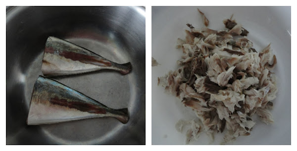 Cuando el pescado esté templado, retiramos la piel, las espinas que pueda tener y desmigamos colocando en un cuenco. Reservamos.