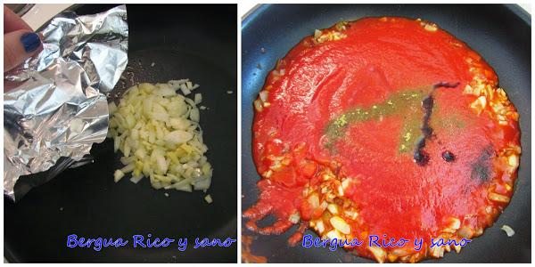 1. Primero empezamos la salsa de tomate. Calentamos una cucharada de aceite en una sartén. Echamos la cebolla y el ajo picaditos y los cubrimos con un trozo de papel de plata, bajamos el fuego a bajo-medio y dejamos cocinar. Al hacerlo tapado con papel de plata y a fuego medio, se acelera el proceso de cocción.