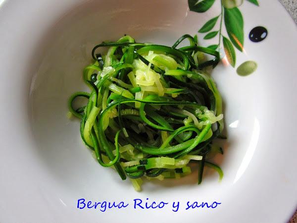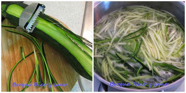 9. Mientras tanto preparamos los espaguetis; lleva 5 minutos. Hay varias formas de hacer espaguetis de calabacín; con una máquina espiral, con este instrumento que yo tengo o incluso con un rallador. Yo no retiro la piel para no perder vitaminas.