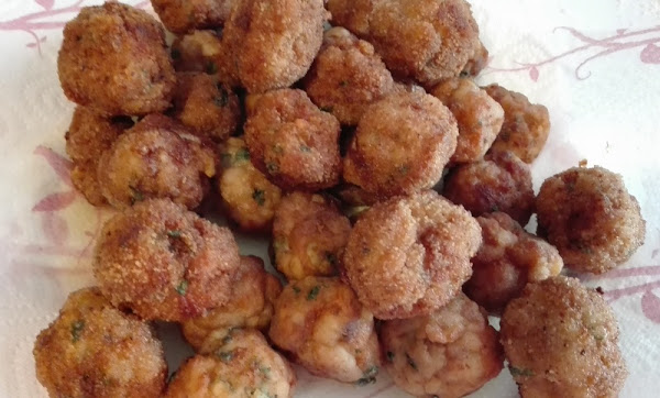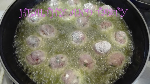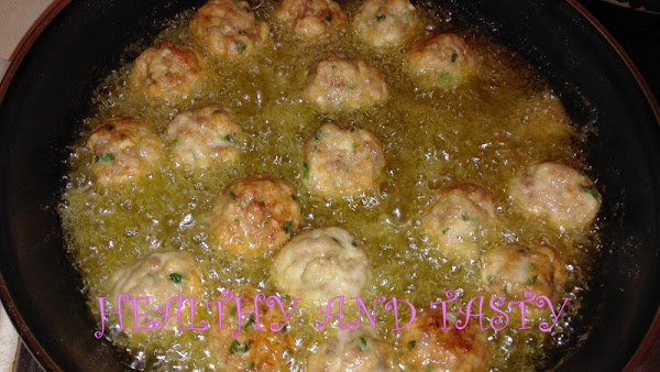 Freímos las albóndigas en abundante aceite y las ponemos en un plato sobre papel absorvente. Reservamos