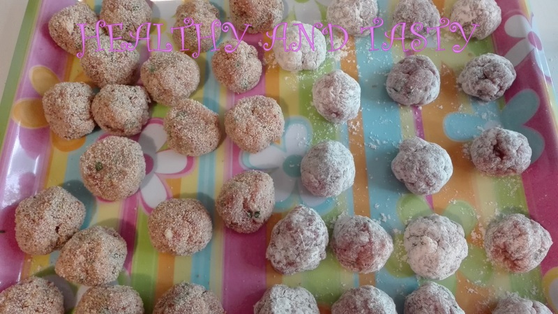 Pasamos las bolitas por harina o pan rallado. Yo he pasado la mitad por cada cosa. Ambas opciones quedan buenas. Para que sea más fácil pasarlas por harina o pan rallado, llenamos medio vaso de harina, echamos la bolita, movemos en círculos el vaso y se enharina sola la bolita. Una vez rebozadas, las vamos colocando en una bandeja.