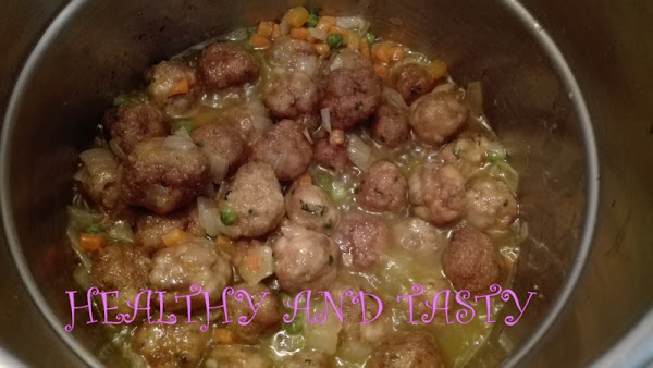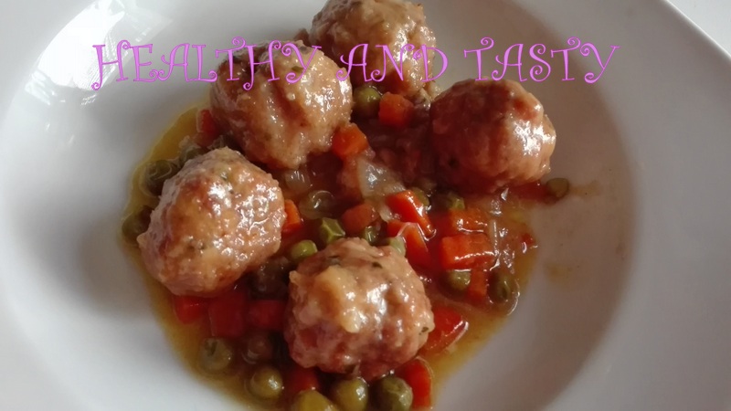 Para preparar la salsa colamos con un colador el aceite de haber frito las albóndigas y lo utilizamos para cubrir el fondo de la olla. Rehogamos a fuego medio-fuerte una cebolla cortada en brunoise. Cuando la cebolla esté medio hecha, agregamos las zanahorias cortadas en daditos y los guisantes. Se rehoga todo junto unos minutos y se añaden las albóndigas. Removemos todo y añadimos el vino. Cuando el vino se evapore, agregamos agua hasta que las albóndigas queden cubiertas y sal. Tapamos la olla (una olla normal, no de presión). Dejamos cocinar unos 30 minutos aproximadamente, hasta que las albóndigas estén hechas y la salsa lista.