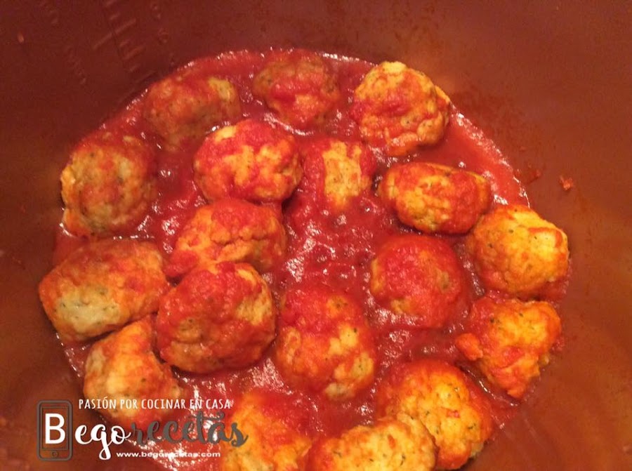 Cuando estén listas las albóndigas, las incorporamos a la cubeta con el tomate, cerramos tapa y válvula y programamos menú cocina (modelo D), menú guiso 130º presión baja (modelos E y F) 3 minutos.
