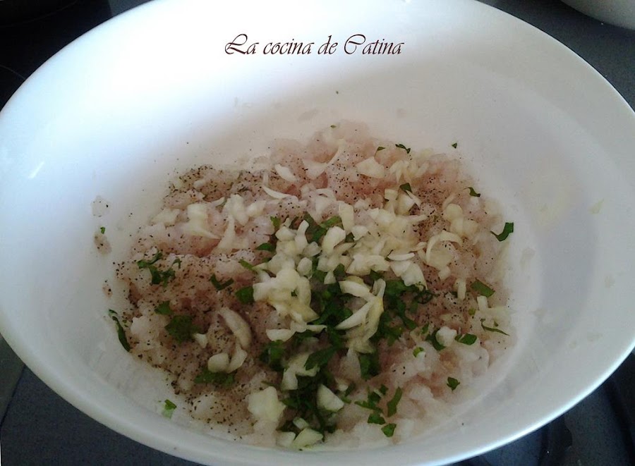 Desmenuzar la merluza o picarla en una picadora, salpimentar, añadir el perejil picado, el huevo y media cebolla picada muy fina. Mezclar todos estos ingredientes hasta que estén integrados y luego mover con las manos para que se unan.