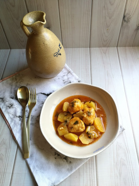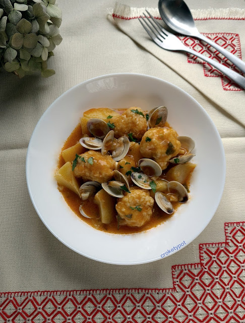 El plato de hoy es de los clásicos, unas albóndigas de pescado con patatas y chirlas, aunque las almejas son opcionales, si no las tienes quedan fantásticas con sus patatas.
