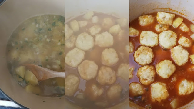 En una cazuela pondremos aceite, la chalota y el ajo picado, doramos un poco, añadimos el perejil, la harina movemos bien y ponemos el vino dejamos evaporar el alcohol, y añadiremos el caldo cuando hierve se pondrán las patatas cortadas en cascos.