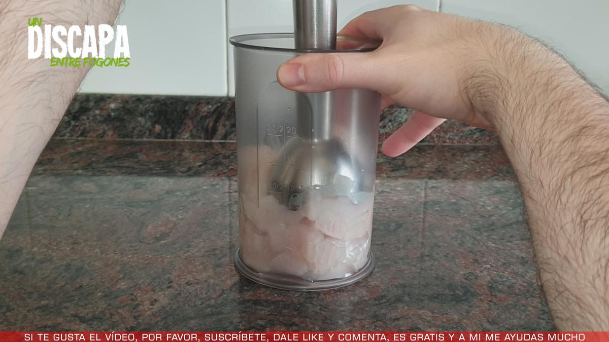 Hacemos unos trozos medianos y los metemos en un vaso batidor. Después, procedemos a triturarlo y una vez triturado lo añadimos en un recipiente amplio.