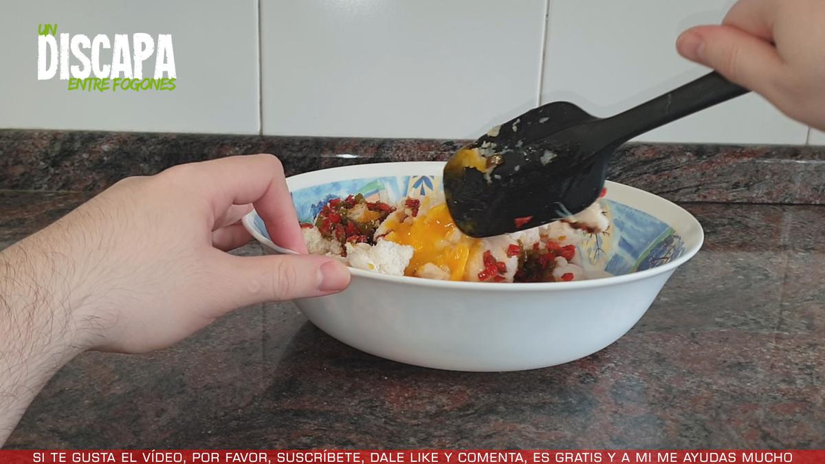 3En ese mismo recipiente, añadimos 4 yemas de huevo, 2 rebanadas de pan de molde en trozos y el pimiento rojo y verde que ya tendremos bien pochados, le ponemos una pizca de sal y procedemos a mezclar todos los ingredientes.