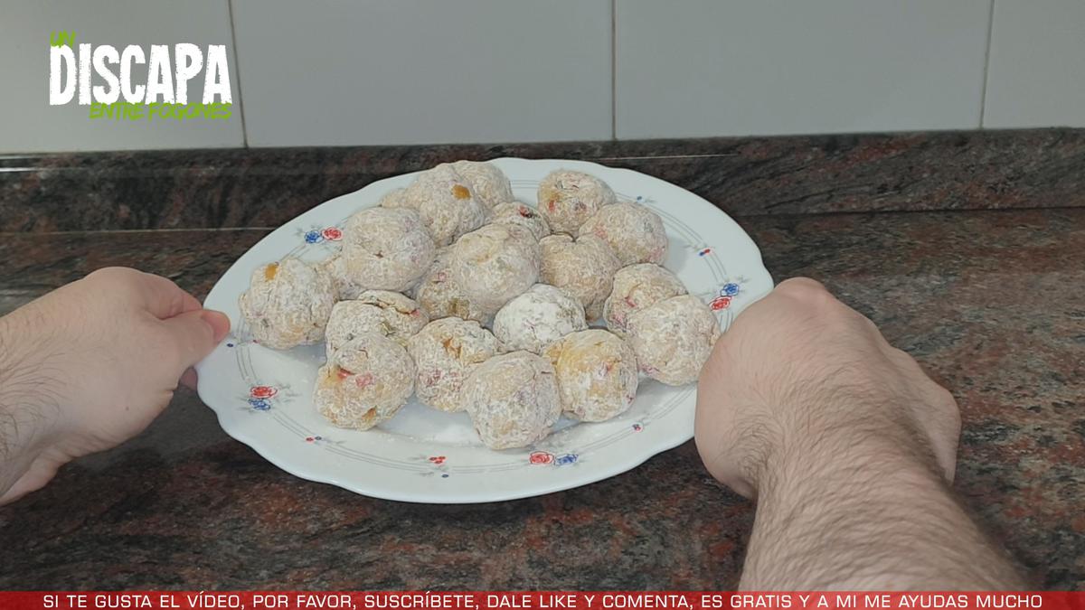 Mientras tanto, vamos a coger porciones de la masa y vamos a darle redonda, pasamos la albóndiga por harina y la reservamos en un plato. Repetiremos la operación hasta terminar con toda la masa.