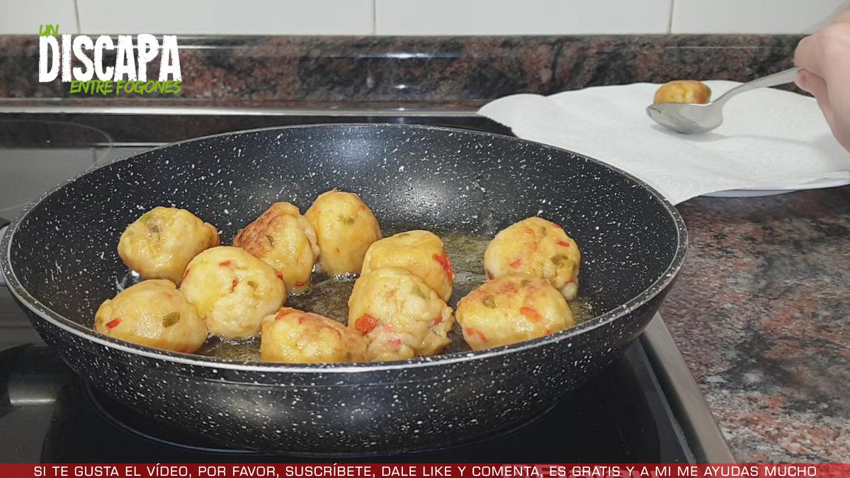 5Añadimos las albóndigas a la sartén y dejamos que se vaya dorando a fuego medio. Y una vez doradas las reservamos en un plato con papel absorbente.