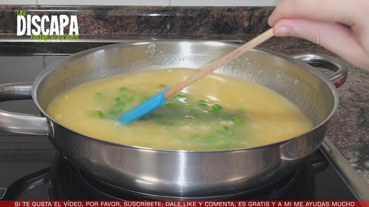 7Cuando ya lo tenemos bien pochado añadimos una cucharada de harina y la cocinamos uno o dos minutos, después, añadimos el vino blanco y dejamos que se evapore el alcohol, después añadimos el caldo de pescado y añadimos también unos guisantes y dejamos que hierva durante 5 minutos.