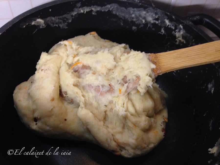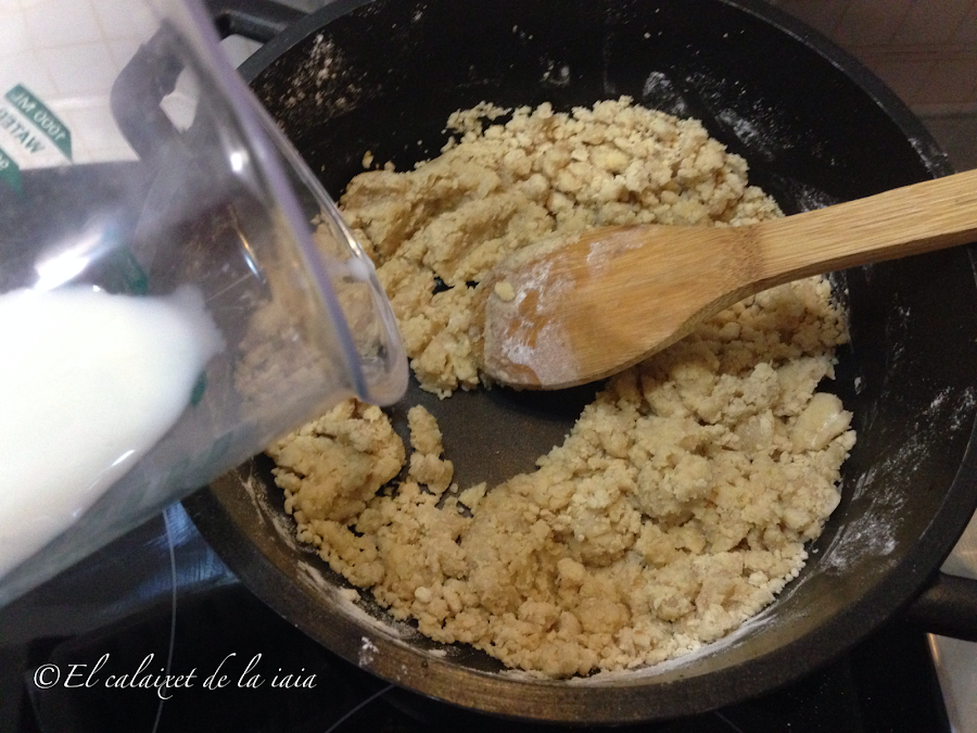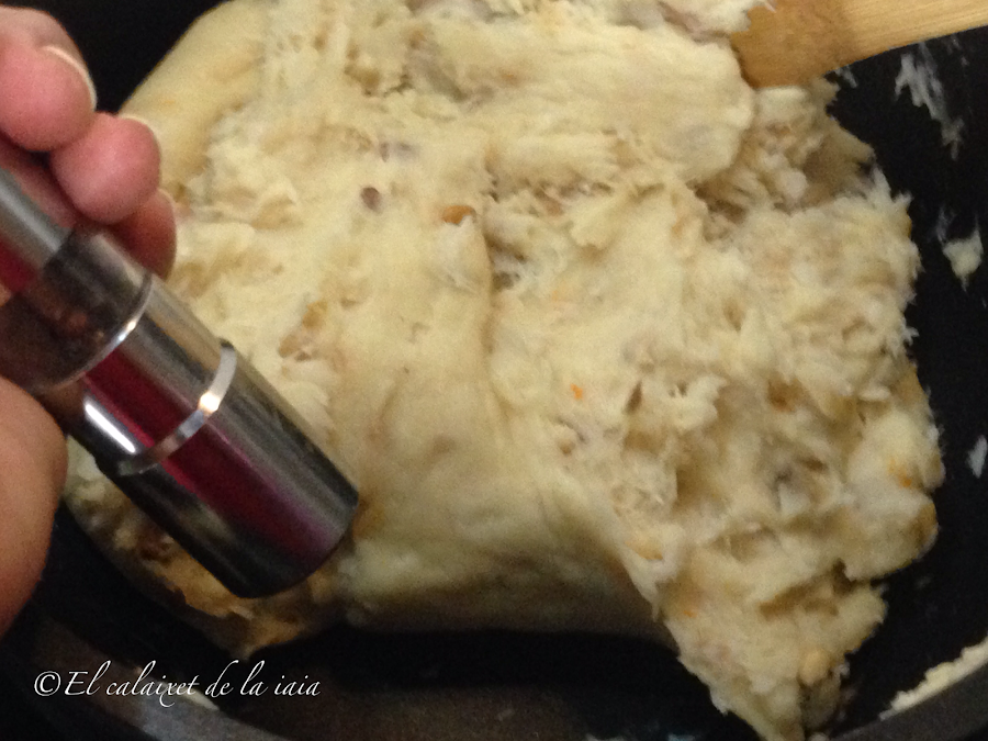 No podemos olvidar dejar de remover la masa en todo momento y veremos que se despega facilmente de la sartén, entonces añadimos el bacalao