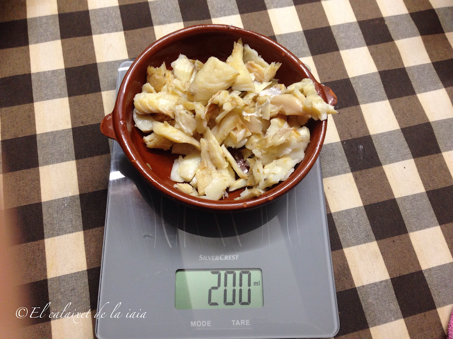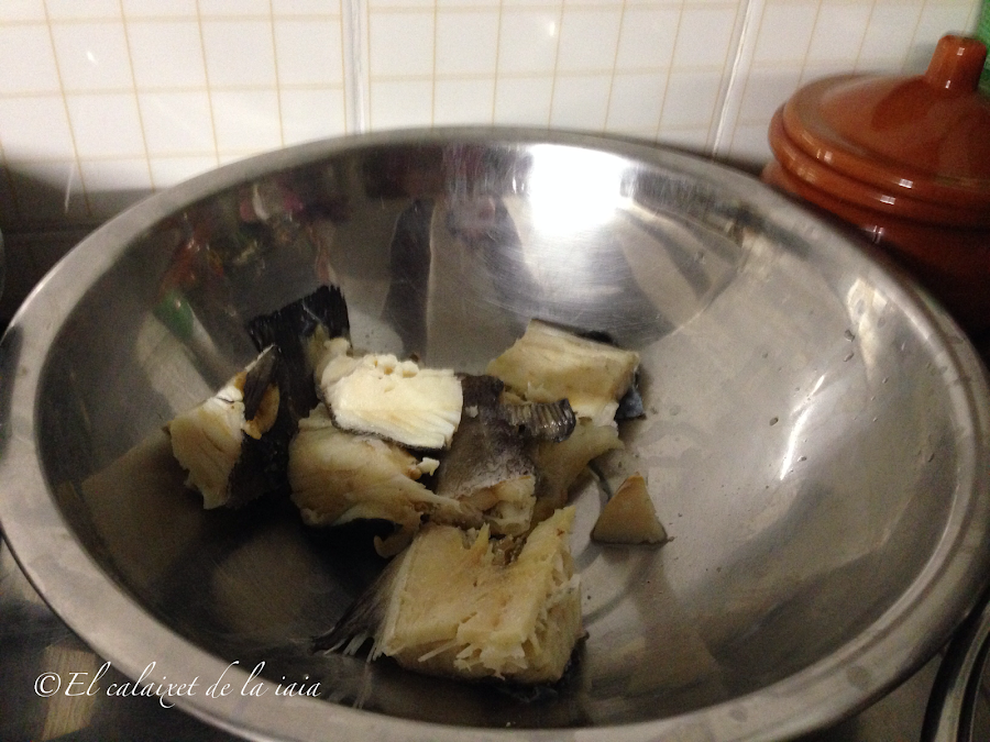 pelamos y desmenuzamos el bacalao, pasandolo con mucho cuidado con los dedos buscando eliminar si ha quedado alguna espina