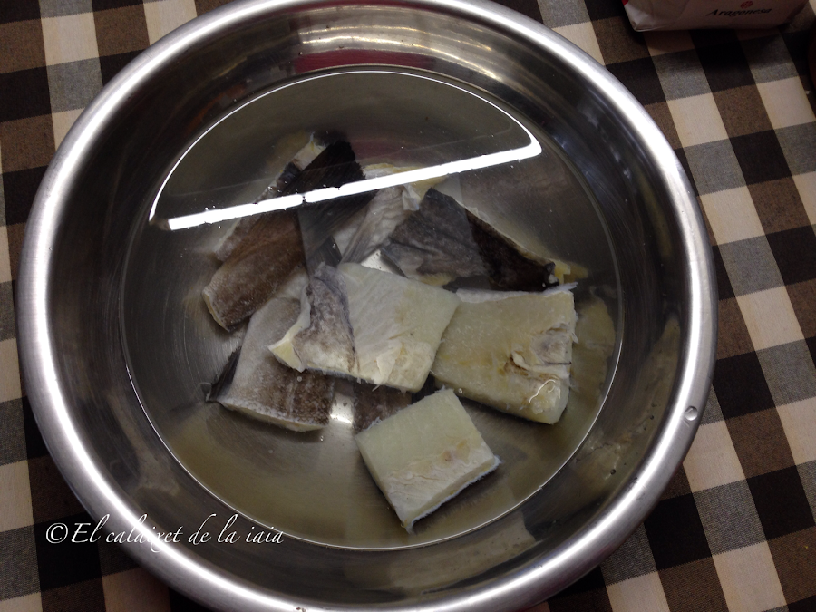 Como en toda preparación con bacalao salado debemos comenzar el día antes poniendo el bacalao a remojo en agua fresca, toda la noche como desalar bacalao
