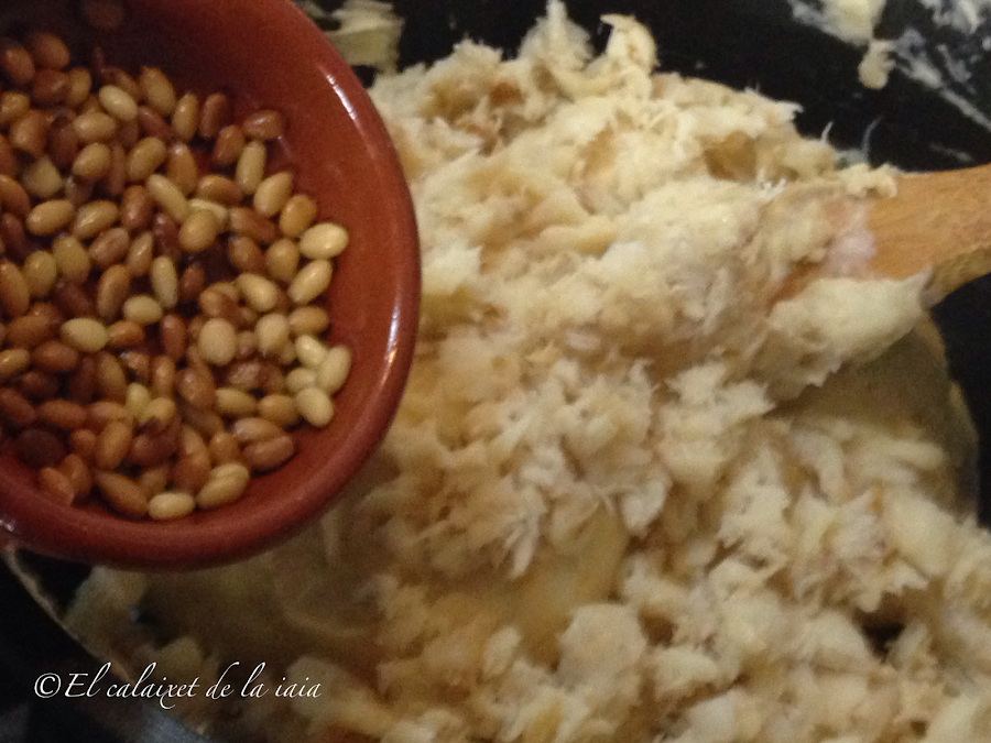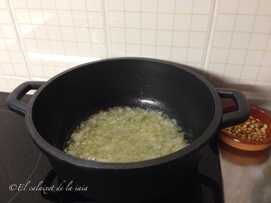 Mientras en la olla, derretimos un poco de mantequilla al fuego , doramos los piñones y los reservamos
