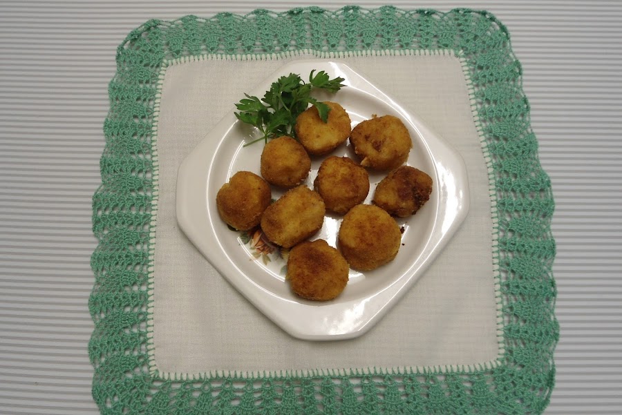 Después se añade el jamón picado, la yema de huevo,la nuez moscada, sal, pimienta,y un poco de queso rallado, con la masa se hacen bolitas. Pásalas por harina, huevo y pan rallado y se fríen.