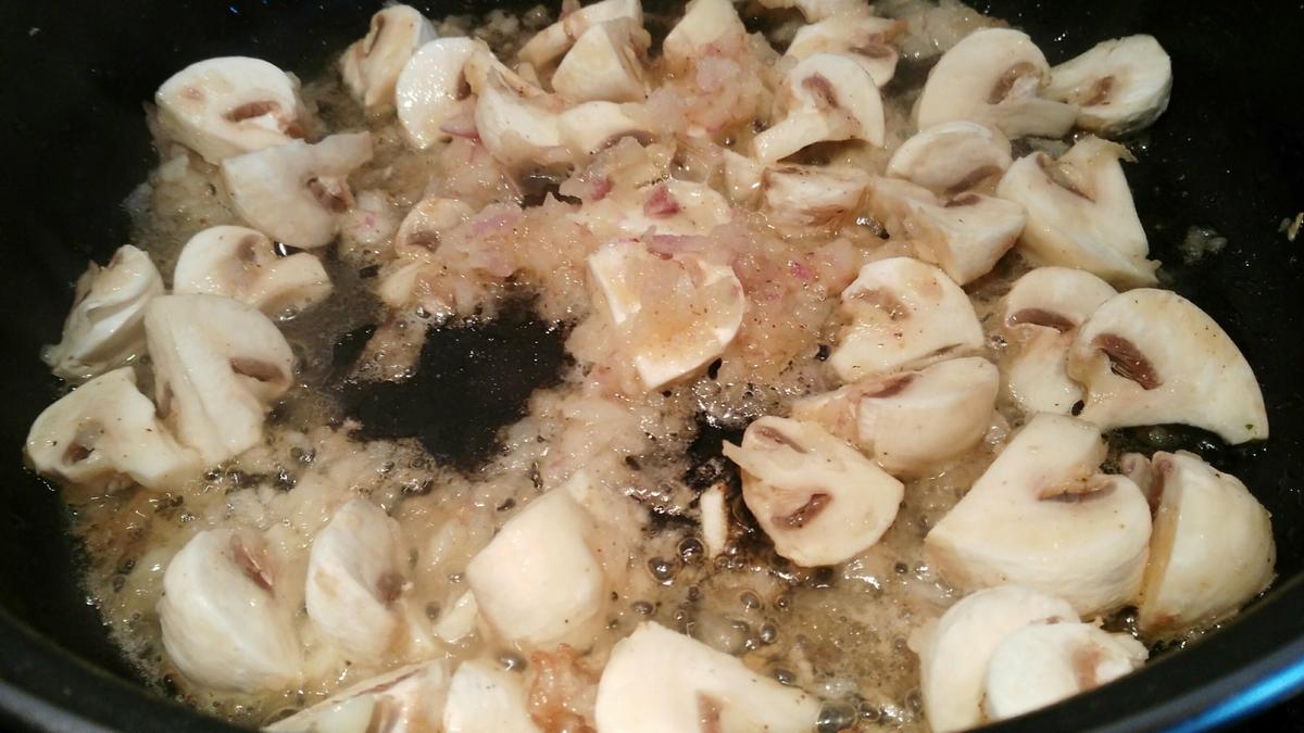 Frielas en una cazuela con aceite. Mientras, ralla la cebolla y trocea los champiñones.