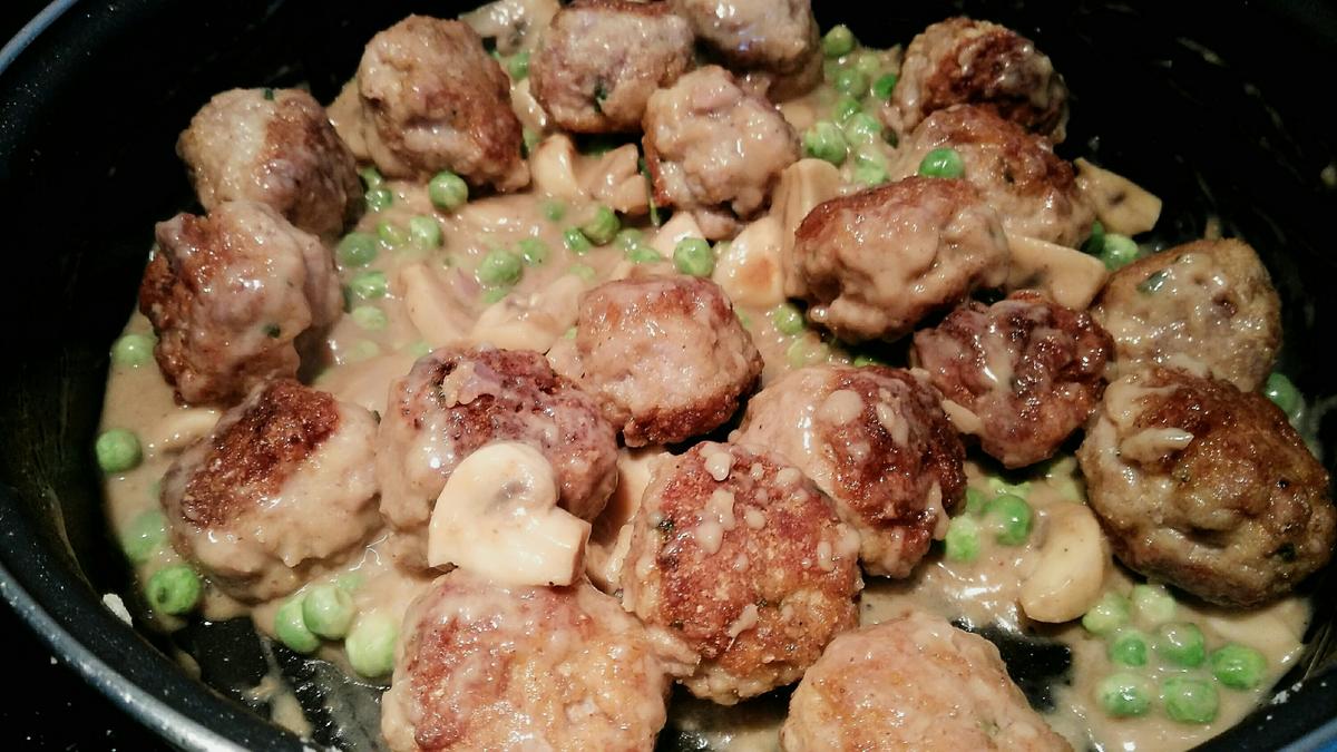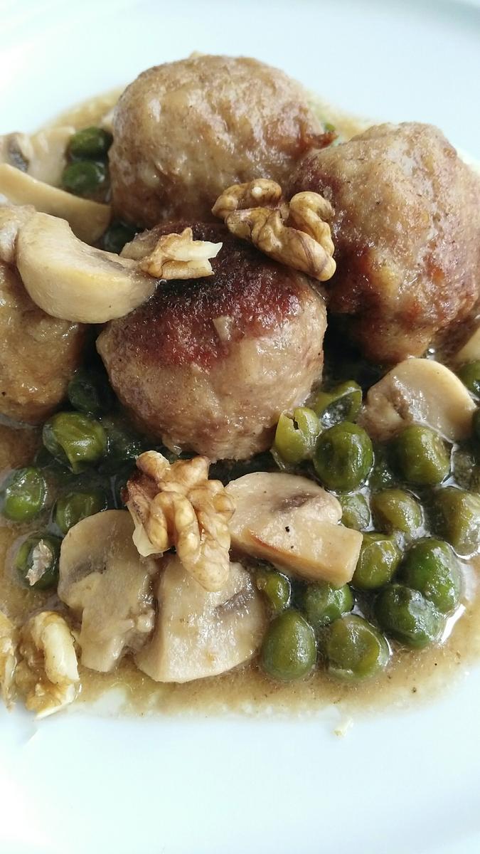 Champiñones, guisantes, nueces, sal, ajo y perejil.