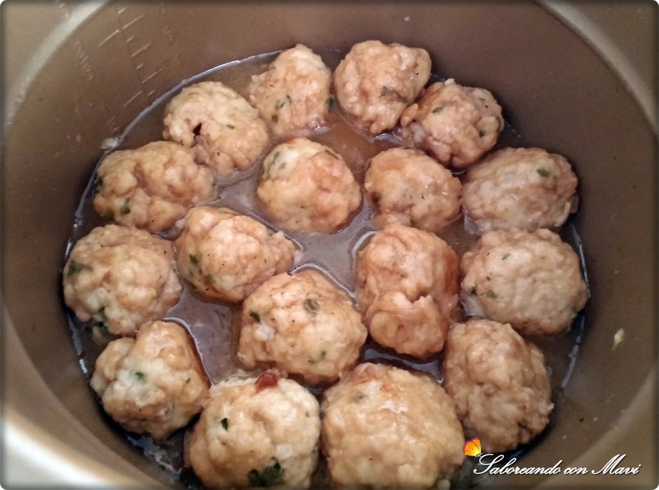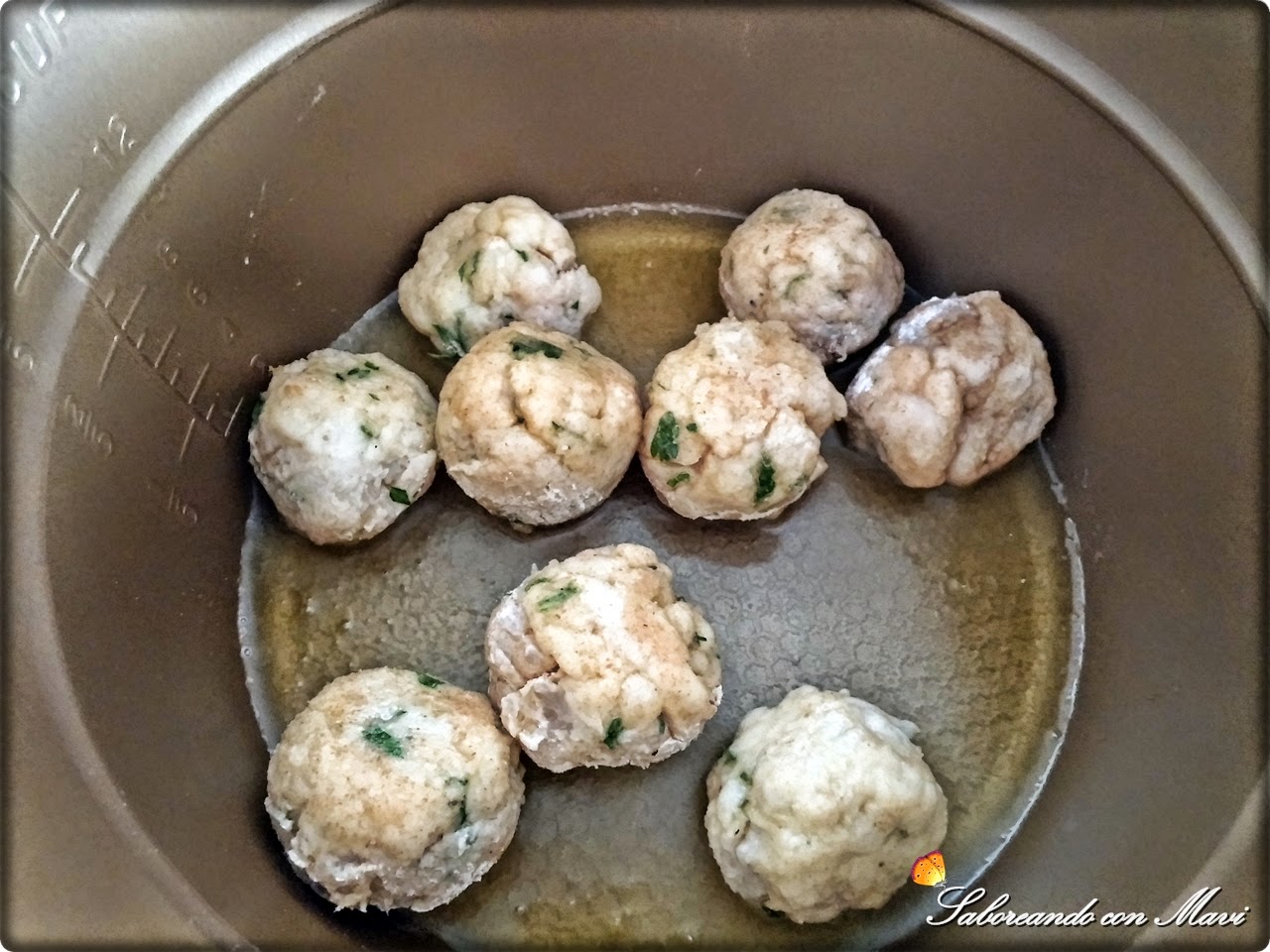 Cubrir el fondo de la cubeta con aceite de oliva virgen extra y en menú sofreír darles una vuelta a las albóndigas. Reservar.