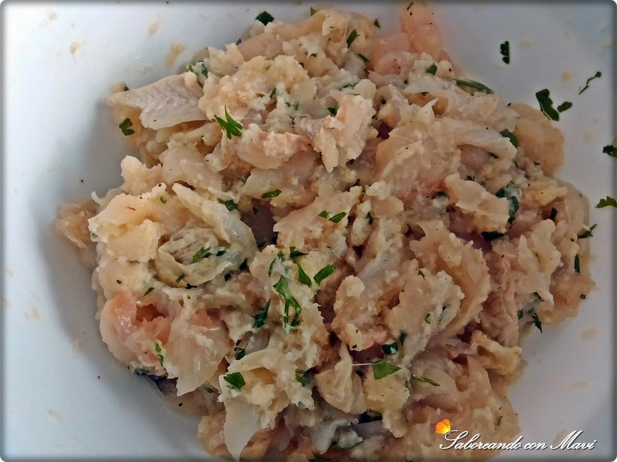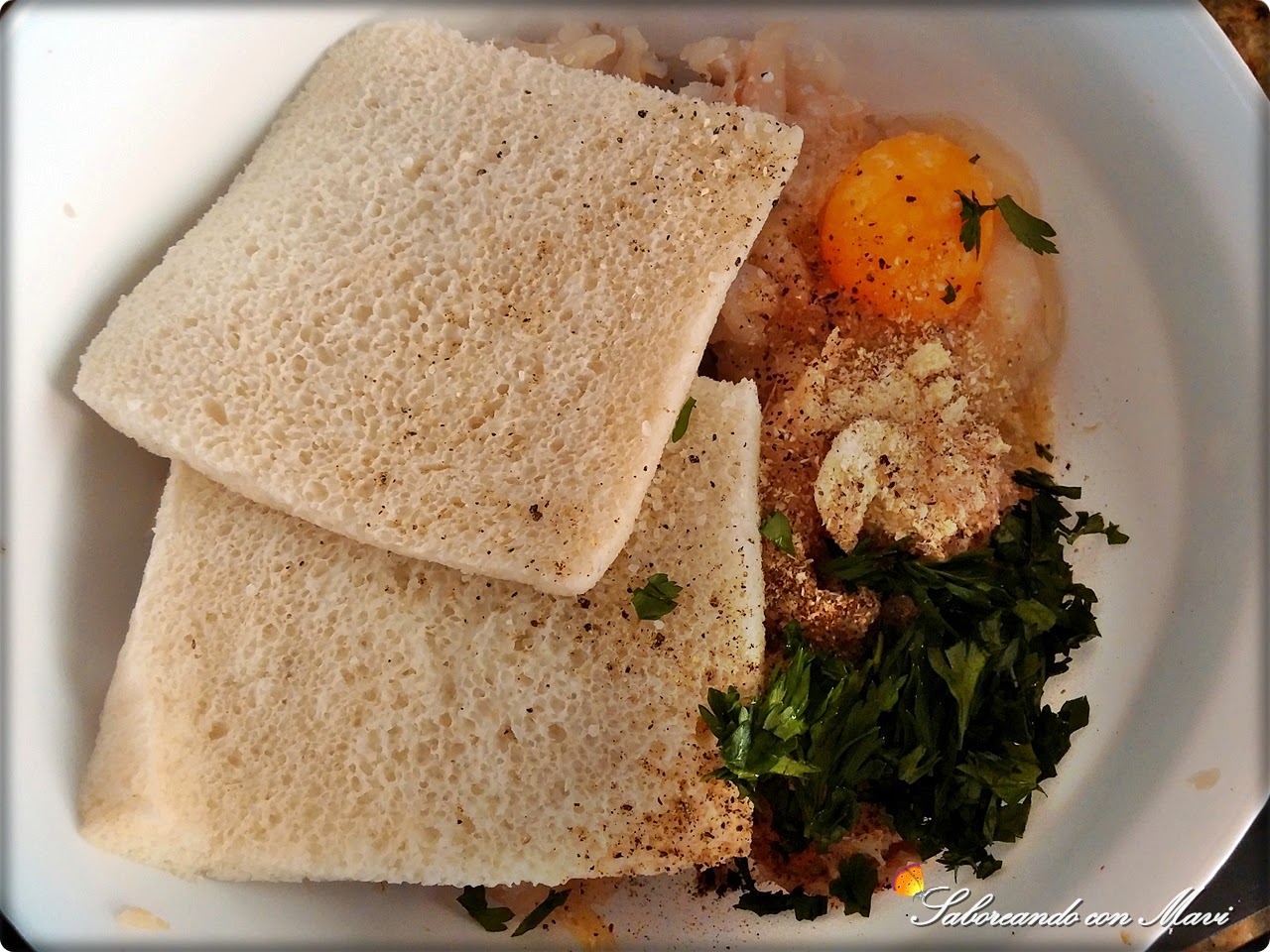 Añadir el pan remojado, el huevo, sal, la cebolla en polvo, la pimienta y el perejil. Mezclar bien.