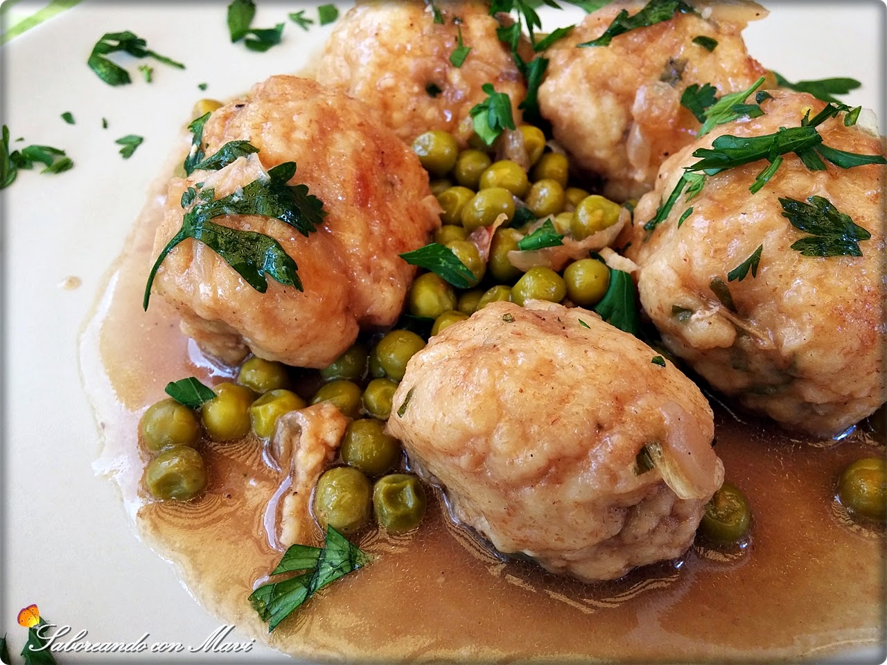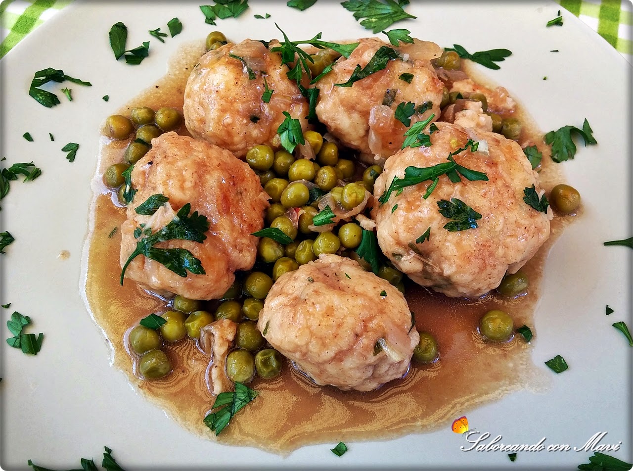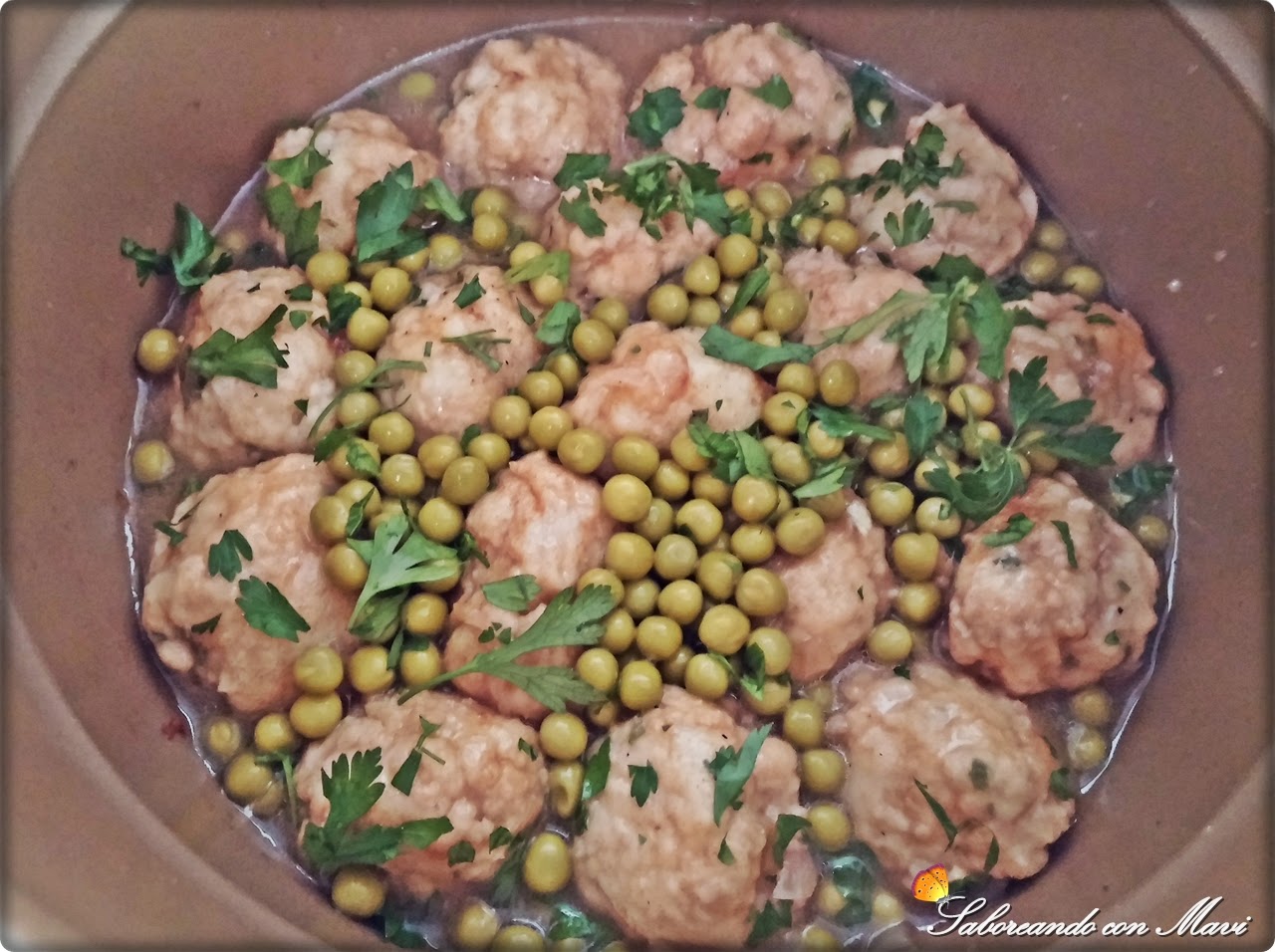 Programar menú pescado válvula cerrada 4 minutos. Pasado el tiempo despresurizar a mano y darle la vuelta con cuidado a las albóndigas, añadir la la latita de guisantes y un poco más de perejil picado, volver a cerrar programando menú pescado válvula cerrada 2 minutos. Despresurizar a mano.