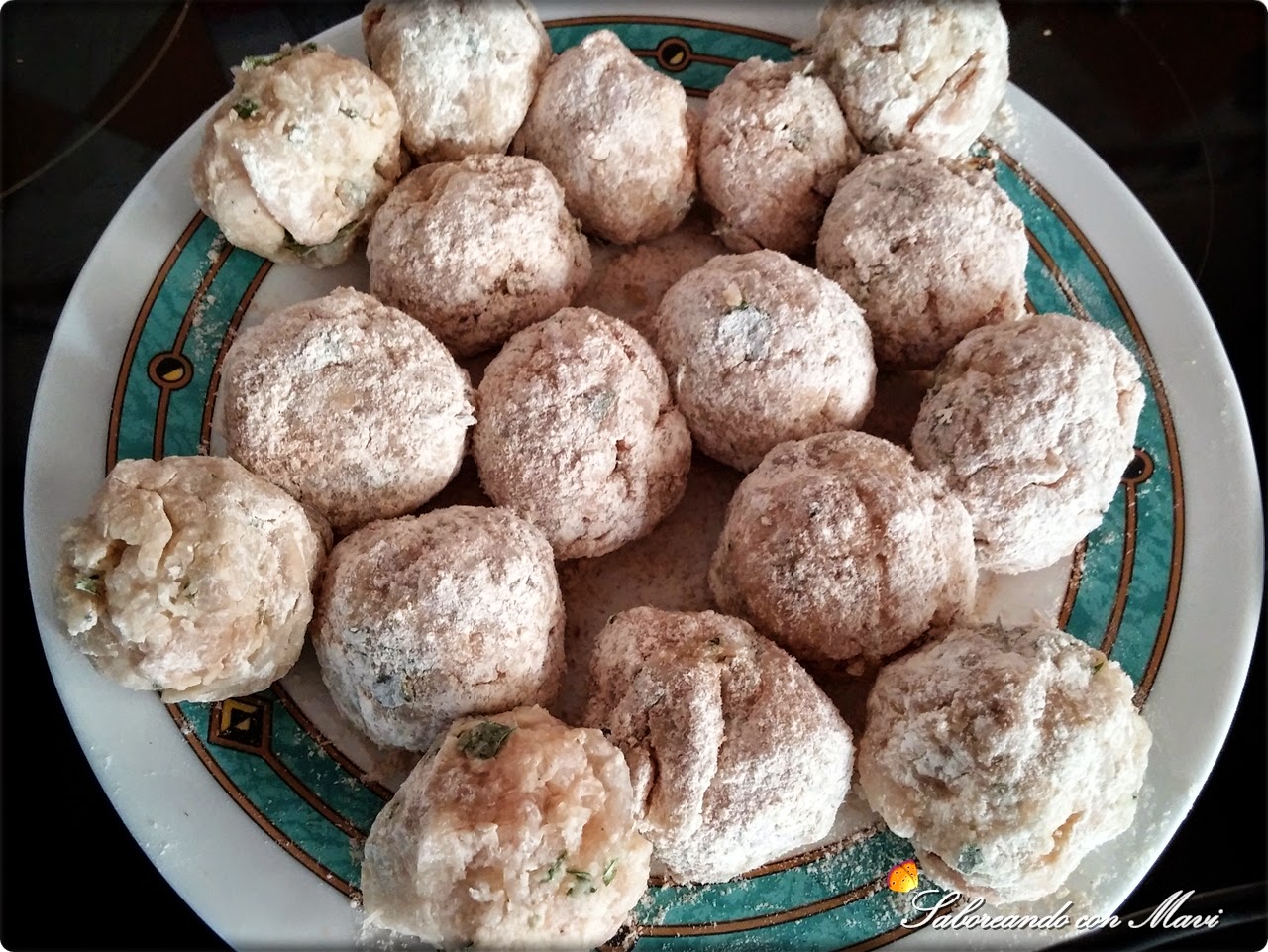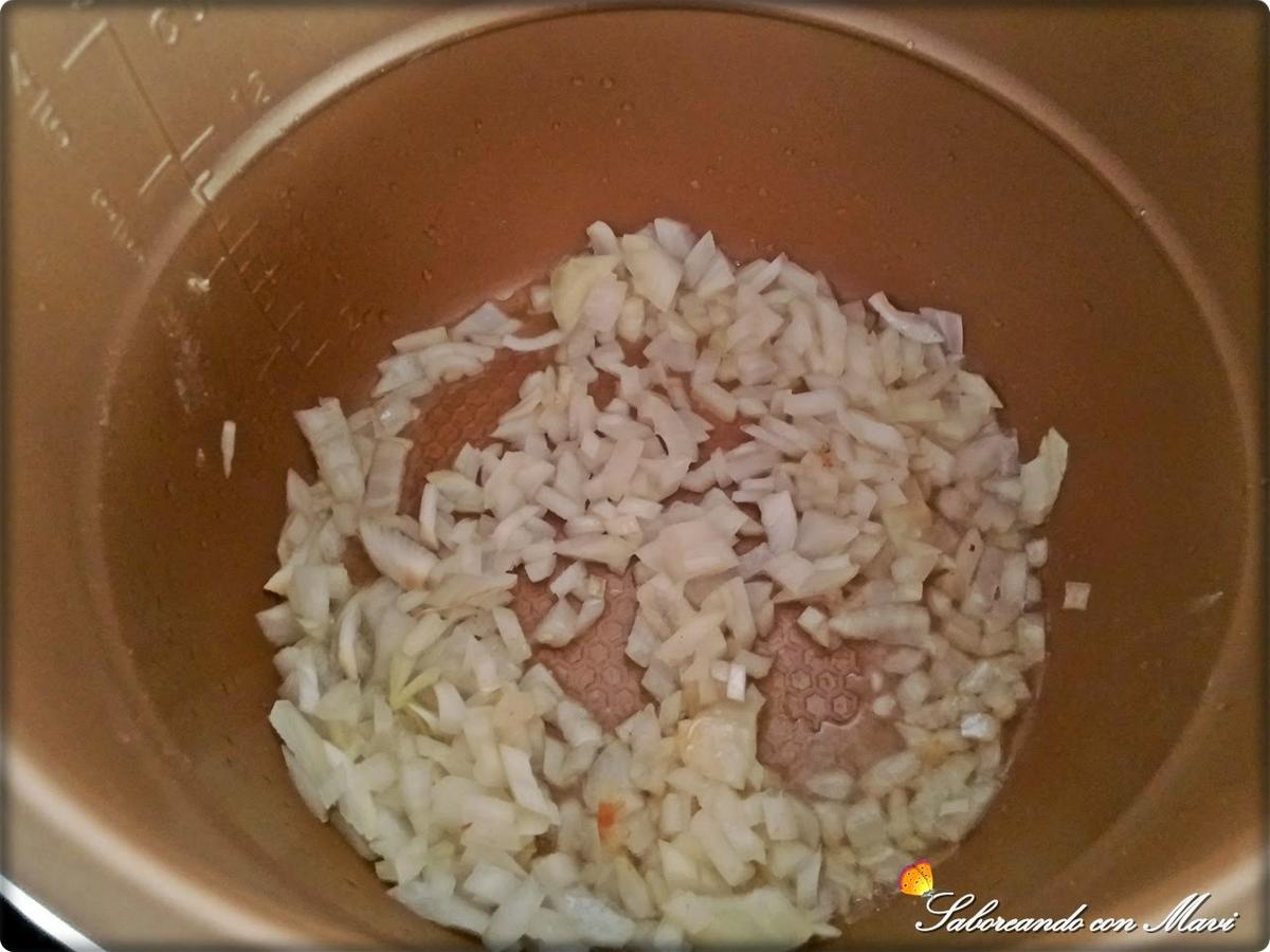 En el mismo aceite, si hace falta se le quita un poco, freímos un poco la cebolla picadita, añadimos un poco de sal y pimienta y enseguida echamos las albóndigas y el caldo de pescado.