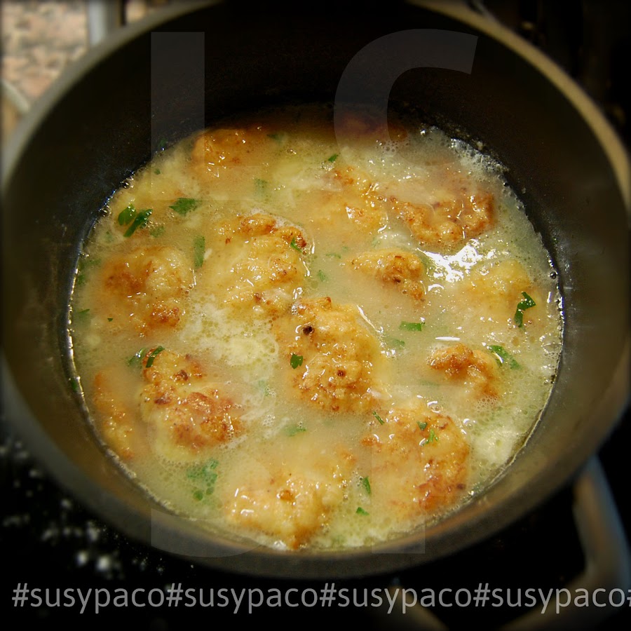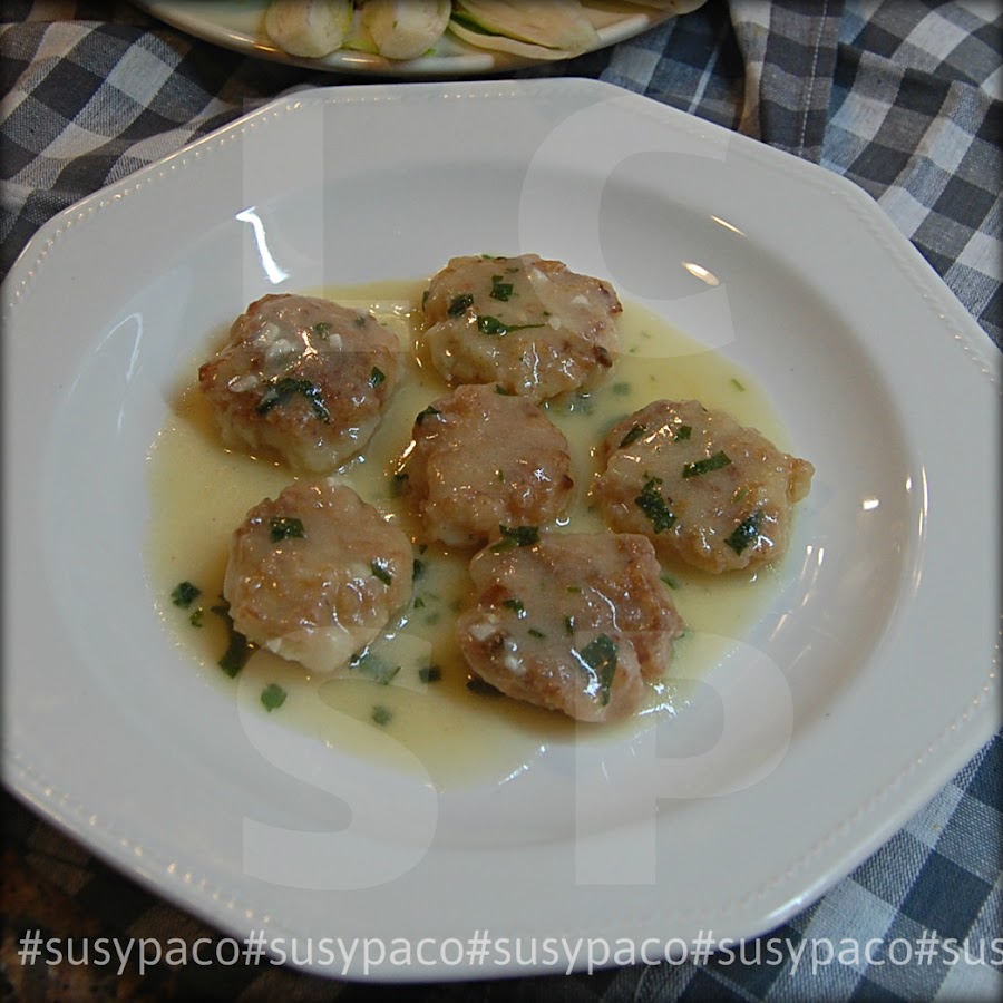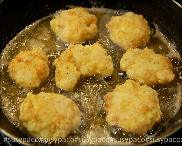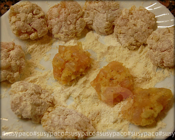 Formamos las albóndigas, las pasamos por harina y las freímos en aceite de oliva hasta que estén doraditas.