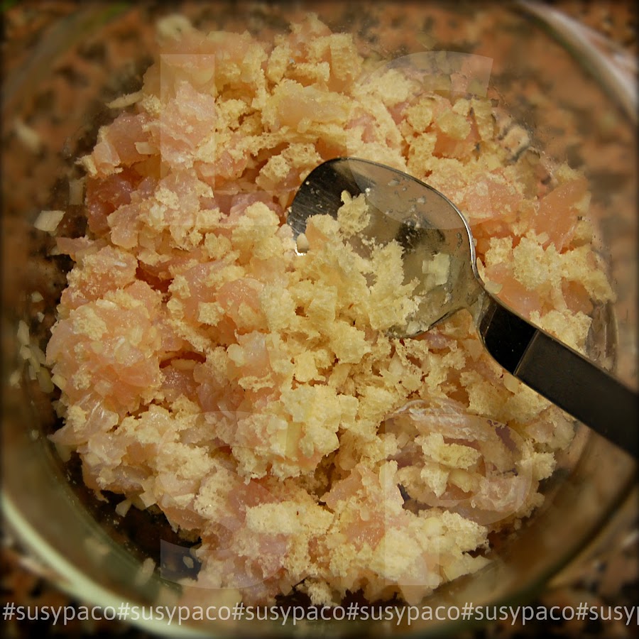 Primero, picamos el pescado muy pequeño (Si quieres, puedes pasarlo por el procesador, quedará más fino pero necesitarás mas pan para darle consistencia) y lo mezclamos en un bol con huevo, miga de pan, sal y pimienta.