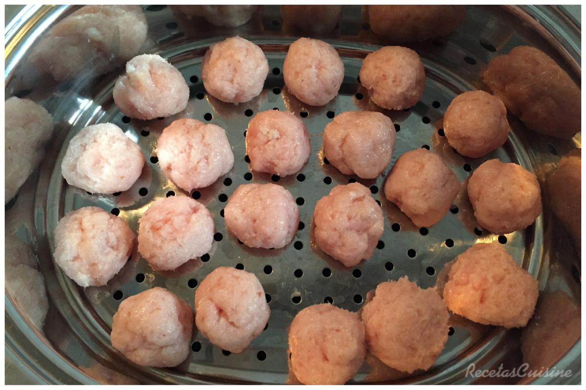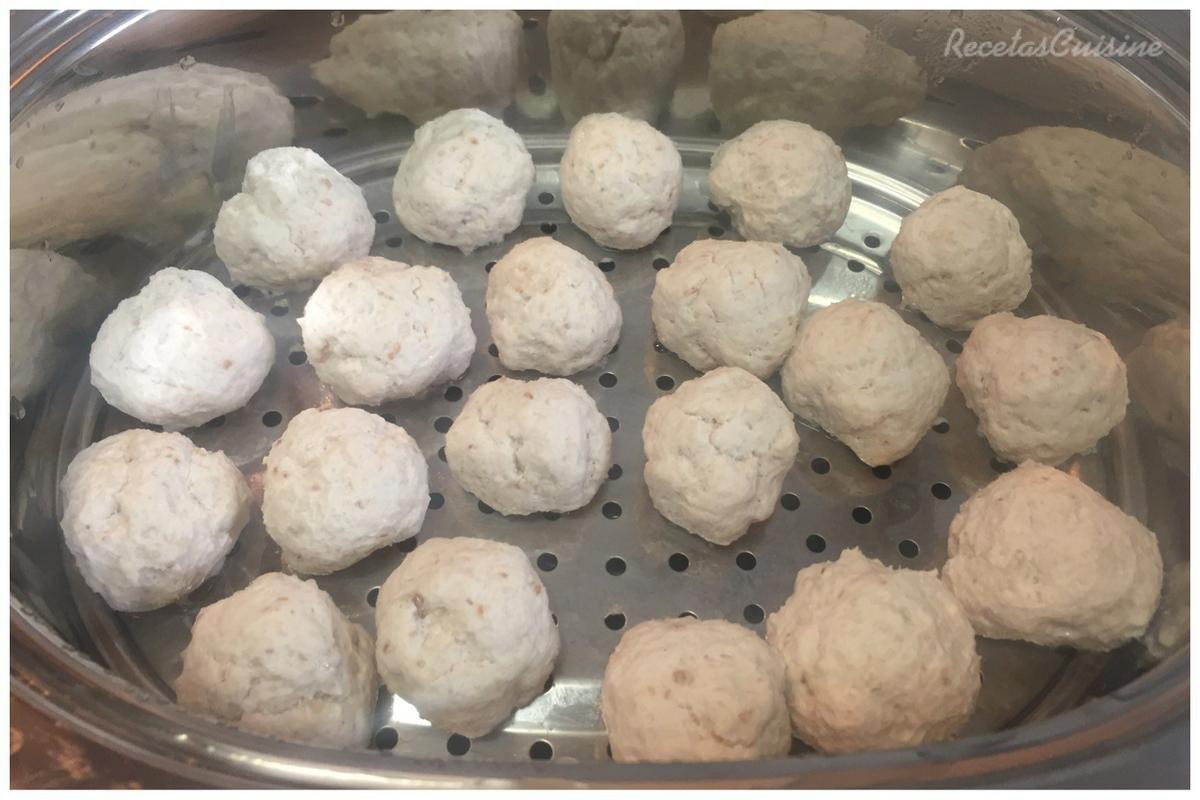 4. Pasado el tiempo de reposo, formamos las albóndigas y las colocamos en la vaporera. Si nos cuesta manejar la masa para darles forma, nos humedecemos las manos con agua y así no se nos pegará y podremos trabajar mejor.