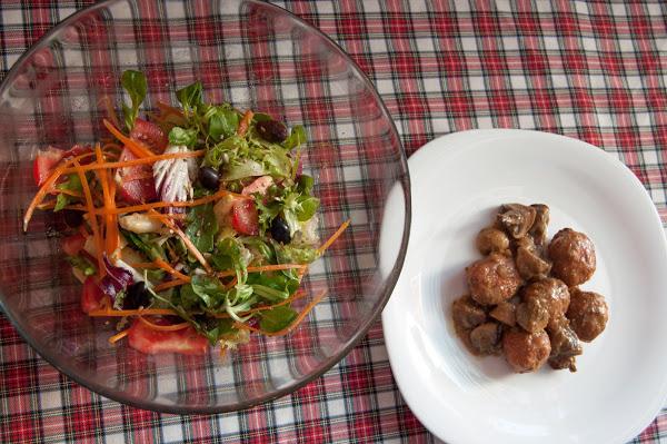 Y el resultado fueron unas estupendas albóndigas de pollo con mostaza a la miel y tomates secos. El acompañadas de champiñones y además un ensalada.