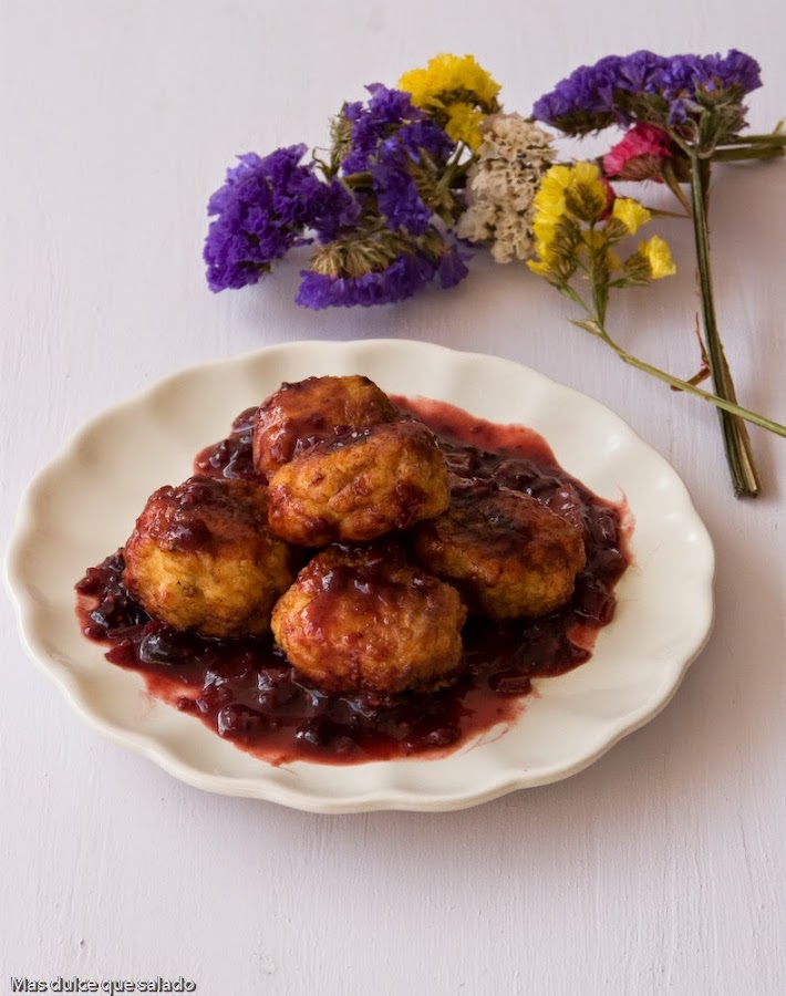 La receta la podéis adaptar a vuestro gusto. Se pueden hacer las albondigas de cerdo o ternera, sí no os gusta el pollo. La mermelada puede ser de frambuesa en lugar de frutos del bosque. Yo he usado mermelada casera pero se puede elaborar con mermelada comprada, aunque os animo a que la hagáis en casa ya que no tiene nada que ver con la que compramos.
