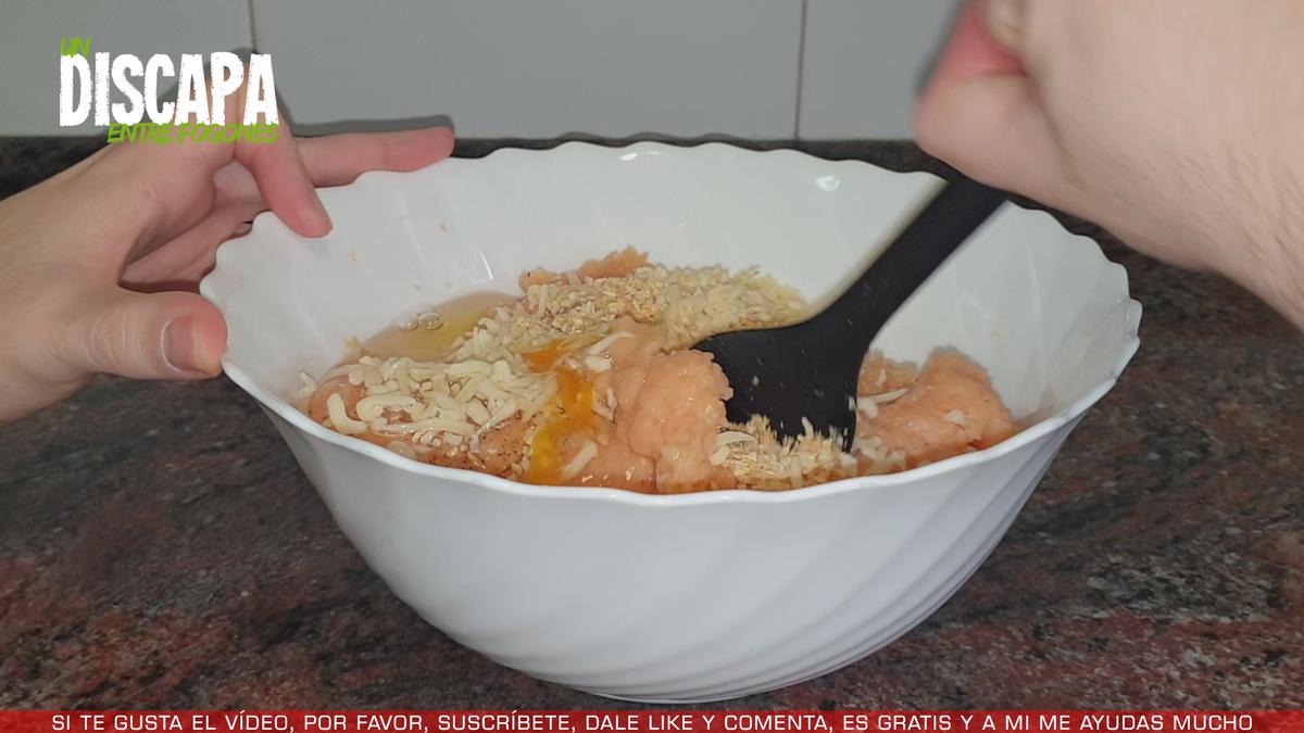 2Una vez que las pechugas ya están picadas las añadimos a un recipiente. Añadimos sal al gusto, pimienta, ajo en polvo, cebolla en polvo y como tengo un poco de queso rallado pues también se lo pongo, añadimos también un par de huevos y empezamos a amasar hasta que se integren todo los ingredientes. Si vemos que la masa nos queda un poco blanda, le podemos añadir un poco de pan rallado.