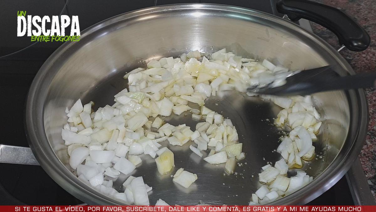 4Mientras la masa reposa, vamos a preparar la salsa, para ello, añadimos un chorrito de aceite en una cazuela y dejamos que se vaya calentando. Mientras se calienta el aceite, vamos a trocear una cebolla o cebolleta, no hace falta trocearla muy pequeña porque luego la vamos a triturar. Una vez troceada, la añadimos a la cazuela, le ponemos una pizca de sal y la dejamos que se vaya rehogando a fuego medio-bajo.