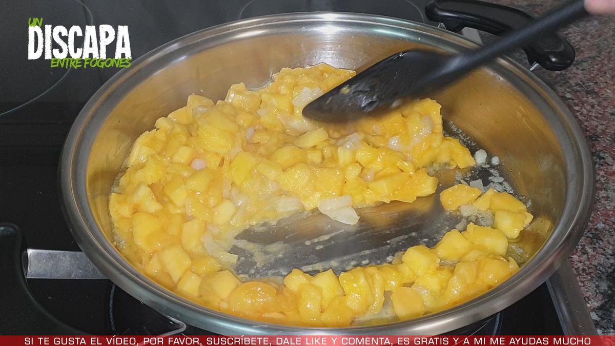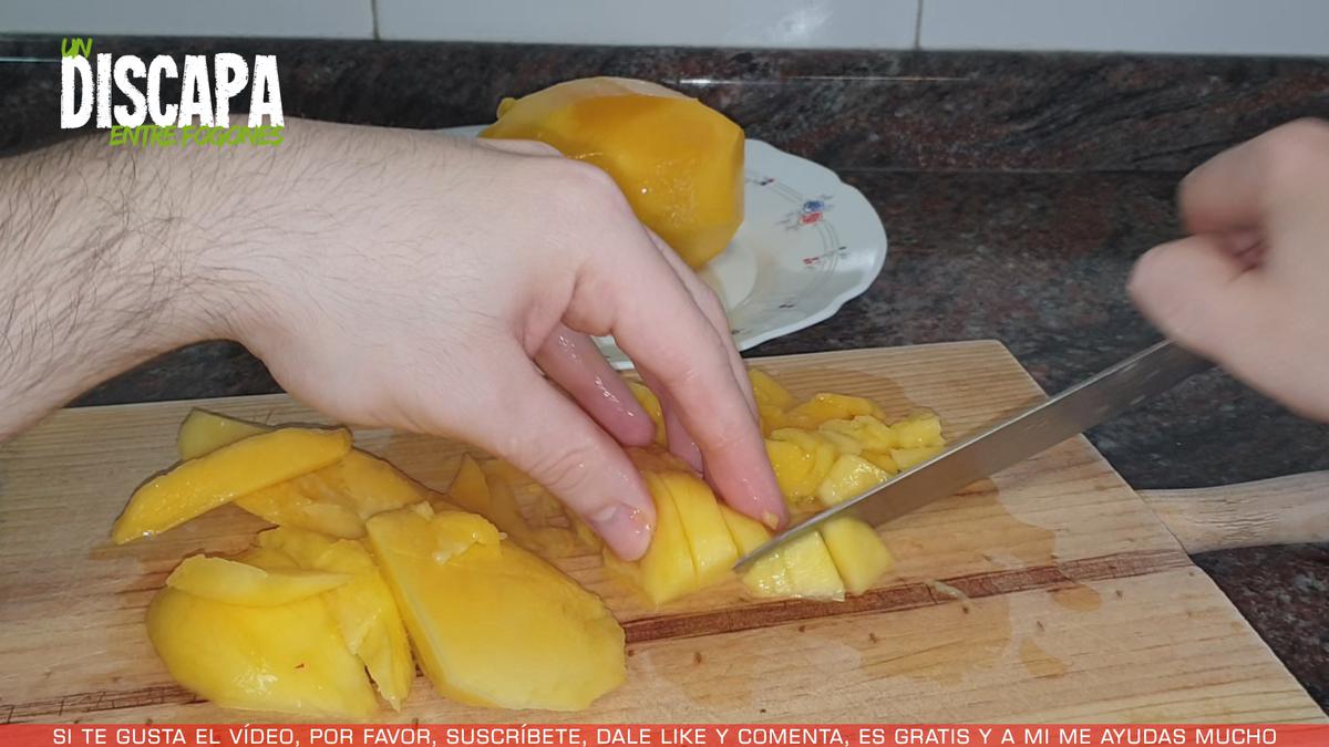 5Ahora, mientras la cebolleta se va pochando, pelamos y troceamos un par de mangos. A medida que vamos troceando el mango, lo vamos reservando en un plato.