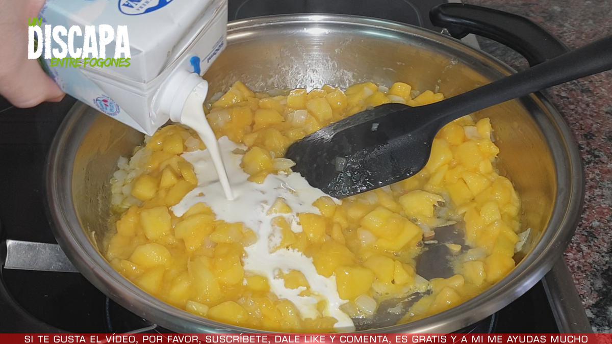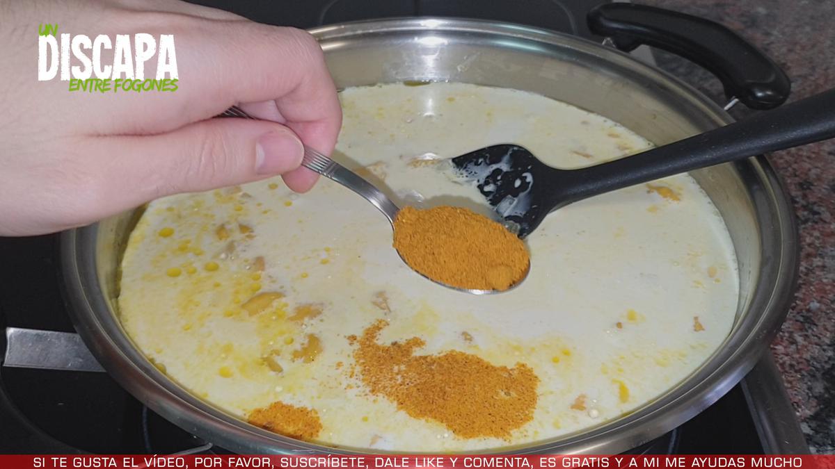 7Después, añadimos la nata (crema de leche) líquida, pizca de sal, y le añadimos una cucharadita de curry. Mezclamos bien y dejamos que reduzca la salsa.